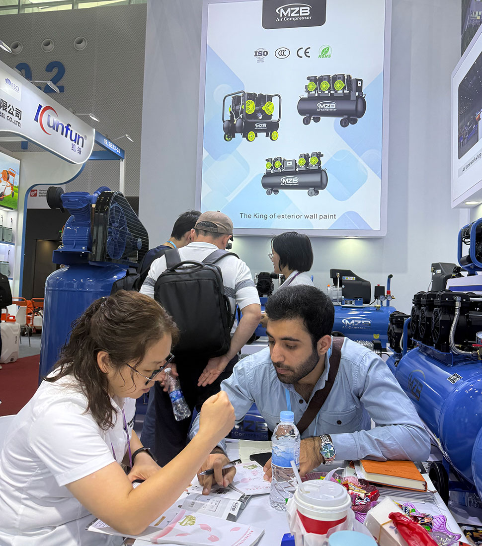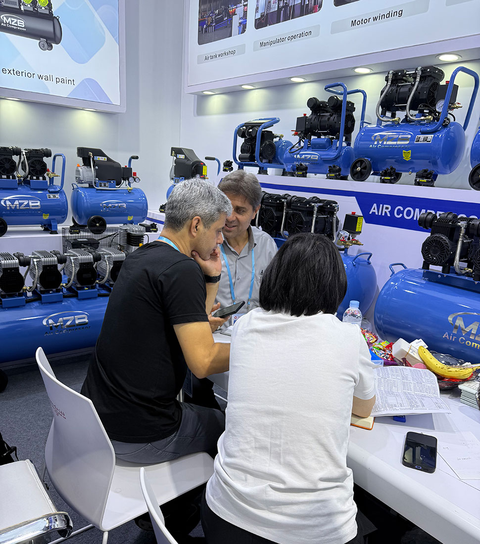The 135th Canton Fair is in full swing! As a well-known brand in the industry, MZB Air Compressors once again participates in this global trade event. Our booth features a modern and simple design with a rich variety of products on display, attracting many domestic and foreign merchants to stop and visit.